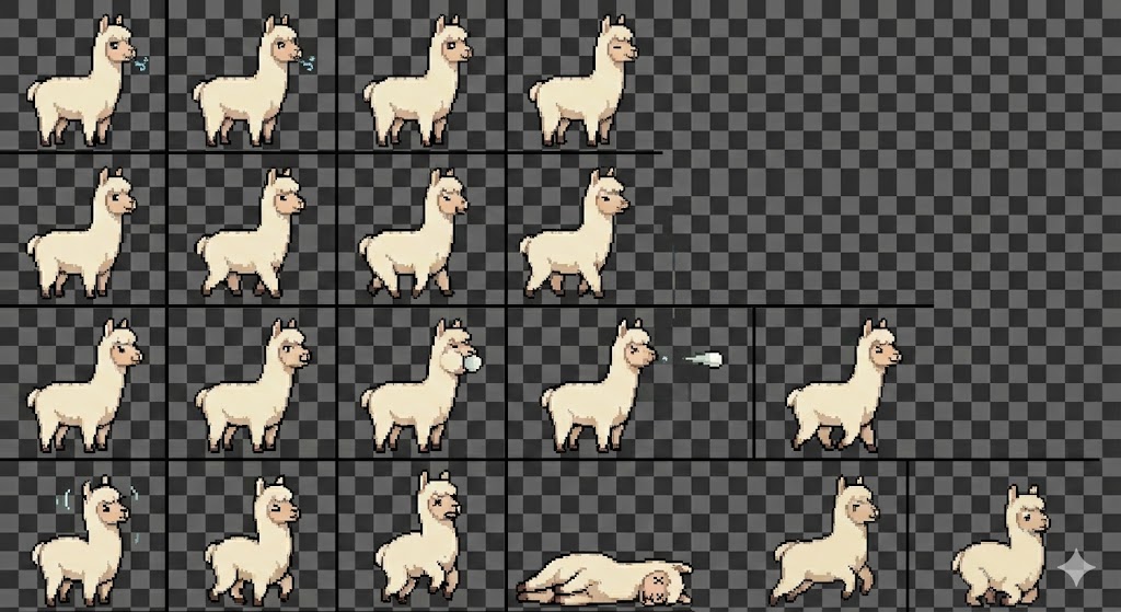作成所要時間20分ほど画像生成時間含む,無理やりアルパカのスプライトシートを切り抜いたら汚くなりました。