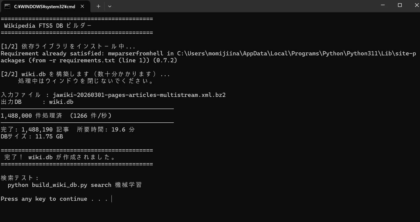 echo [2/2] wiki.db を構築します(数十分かかります)...