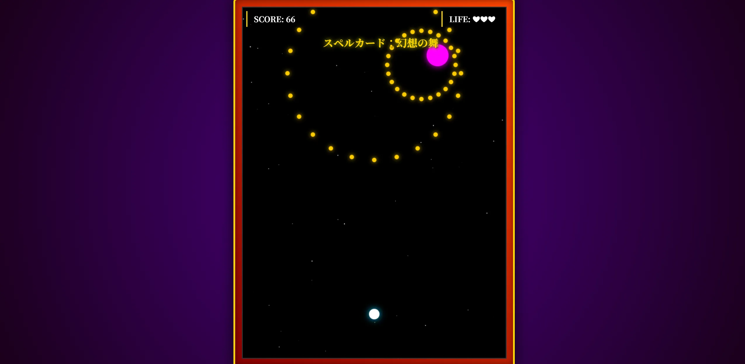あなたは優秀なゲームプログラマーです。HTML5のCanvasとJavaScriptを使用して、東方Projectにインスパイアされた「弾幕シューティングゲーム」のプロトタイプを作成してください。