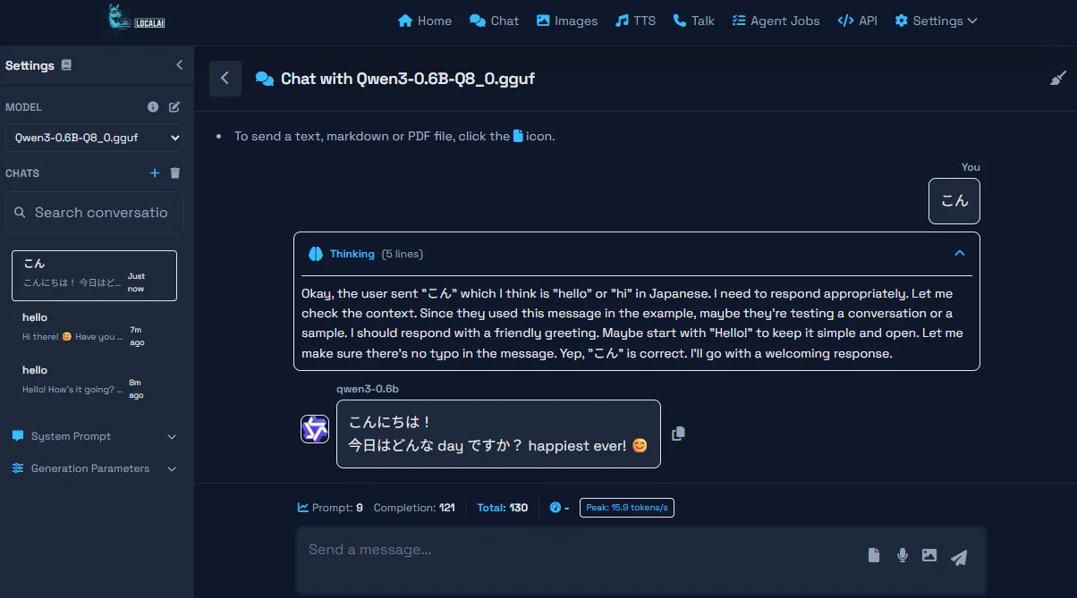 {"created":1768537754,"object":"chat.completion","id":"8ecb8eef-aa29-4e90-8f13-355f09adebeb","model":"Qwen3-0.6B-Q8_0.gguf","choices":[{"index":0,"finish_reason":"stop","message":{"role":"assistant","content":"\u003cthink\u003e\nOkay, the user said \"こんにちは、面白ことをいってみて\" which translates to \"Hello, have you had fun?\" in English. I need to respond appropriately. Let me think about how to reply. Since they're greeting me, the best way is to acknowledge their greeting and show interest. Maybe mention something about being here to help or be fun.\n\nI should make sure the response is friendly and open-ended. Let me check if there's a specific context they might be in, but since it's a general greeting, keep it simple. Avoid any technical terms. Alright, something like \"Hello! I'm here to help, and I hope you had fun!\" sounds good. That covers the greeting and offers assistance.\n\u003c/think\u003e\n\nこんにちは!面白ことをいってみてたらいいな、って感じですね。笑顔でいるってことありますから、いつでもお手伝いできますよ!😊"}}],"usage":{"prompt_tokens":15,"completion_tokens":186,"total_tokens":201}}